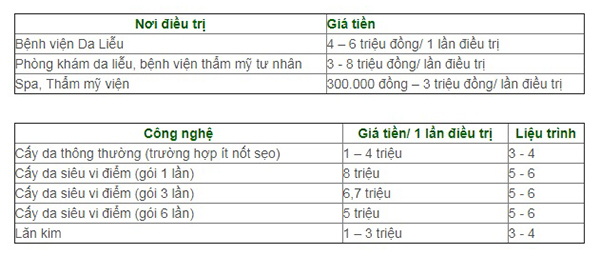 Theo như tìm hiểu của của chúng tôi hiện nay thì mức giá làm mờ sẹo rỗ cụ thể theo từng nơi, từng công nghệ như sau: